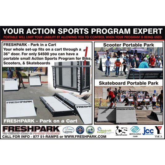 The Freshpark line of Civic programs provide Boys and Girls Clubs, YMCA, Churches, Schools, Camps, Military Bases, and Recreational Centers a means to have a turn-key skate or bike program. Freshpark has 3 packages that can be folded up and be pushed into a closet on a cart, or wheeled into the provided storage box. Packages come with ramps, rails, boxes, boards, pads, helmets, and storage. Freshpark has the only turn-key skateboard/bmx/scooter/inline program in the world.
