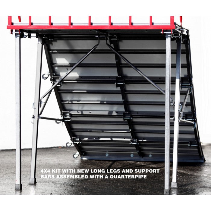 The 4 x 4 Kit comes with 1 curved panel, 1 flat panel, 4 extended legs, and 2 extra support bars. Attach this to an existing Quarterpipe to make a larger, steeper, and longer Quarterpipe. This kit adds an extra foot to the Quarterpipe to let you get more air.