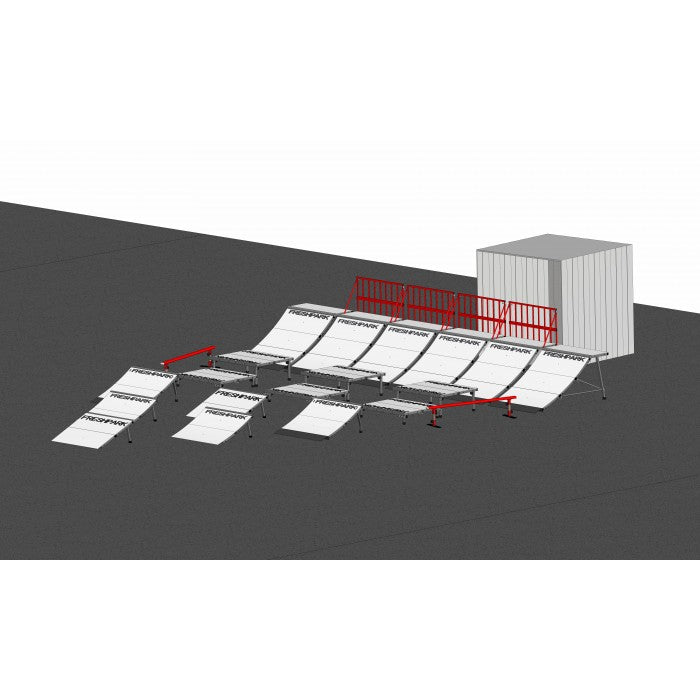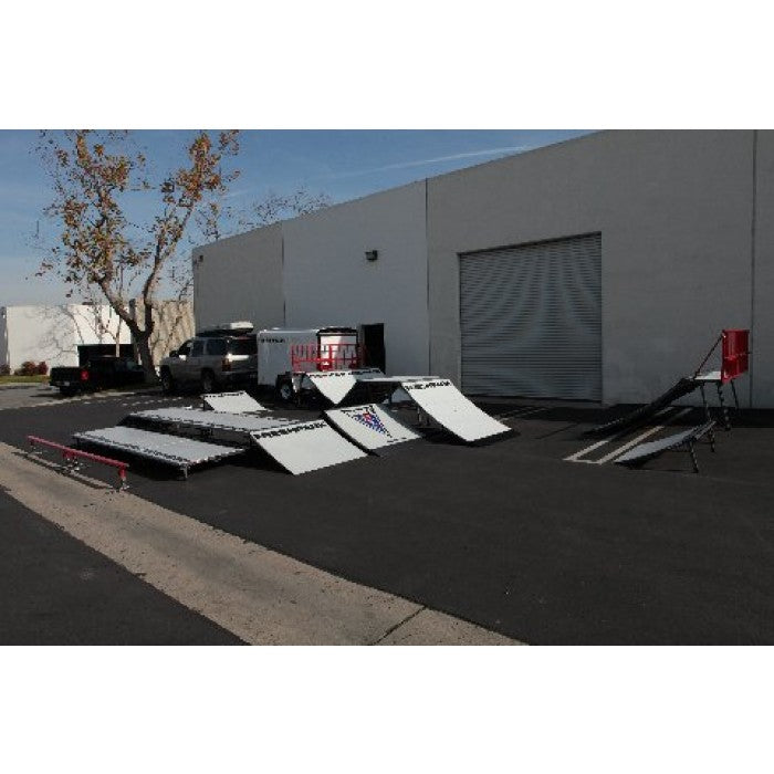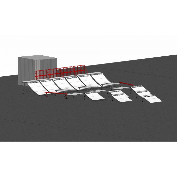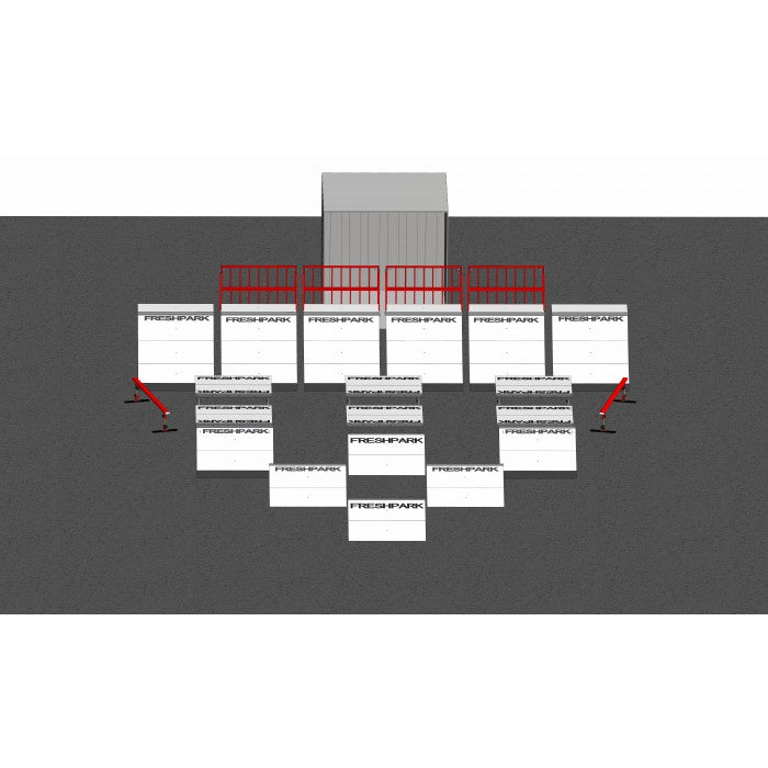 The Park in a Box set up can entertain anywhere from 1 to 50 skaters. Any of the layouts can be assembled in 30-40 minutes once the operators are experienced in how Freshpark products go together. Space needed for the Park in a Box is a minimum of 20ft x 60ft. Perfect for a Basketball half court, Tennis Court, Large Driveway, etc.